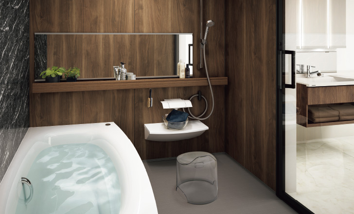 実際に使うお客さまといっしょに考えて生まれた、マンションリフォームにぴったりのバスルーム。おそうじしやすい素材・機能に加え、バスタイムを楽しくする部材も充実しています。