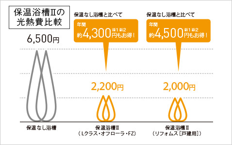 ※1 水道・光熱費算出料金(税抜)■新電力料金目安単価:27円/kwh((社)全国家庭電気製品公正取引協議会)、上水道/下水道料金目安単価:269円/m3(東京都水道局換算式より〈呼び径20mm/使用水量30m3とする〉)、ガス料金目安単価:184円/m3(東京ガス32m3>/月 2014年4月) ■家族条件:4人家族 ■お湯はりして4時間後に追い焚きすると仮定し、その時の湯温低下(6か月間は半分の湯温低下と仮定した平均値)を、保温浴槽Ⅱ:1.50℃、保温なし浴槽:4.45℃とする。 ■浴槽水量:70%深さ(189L)、ガス熱量:45MJ/m3、給湯効率:0.8として計算。年間のガス使用量(m3)は、保温浴槽Ⅱ:12、保温なし浴槽:35.7となります。