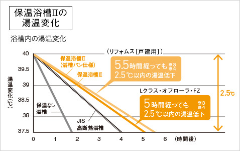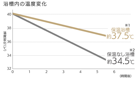 * 湯温低下に関するご注意浴槽内の温度変化は、JIS基準の条件での値です。ご使用の条件で湯温低下は異なってきます。以下の場合は、湯温がカタログ表示値より低下します。