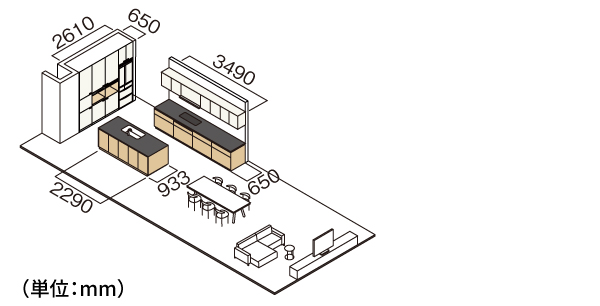 キッチン部(ウォール部):3490×650mm